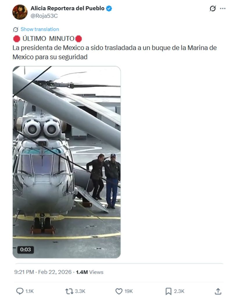 En redes sociales se viralizó un video (1,2,3) de la presidenta de México, Claudia Sheinbaum, abordando un supuesto buque de la Marina. Diversas publicaciones señalan que la mandataria se trasladó a dicha embarcación para resguardar su seguridad tras la muerte de «El Mencho», otrora líder del narcotráfico mexicano.