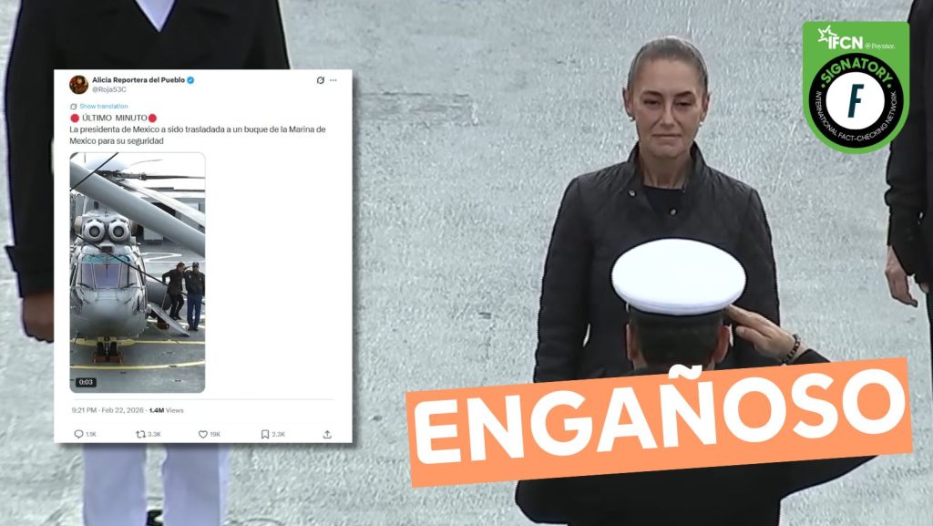 Fast Check califica este contenido como #Engañoso. Si bien es efectivo que el video muestra a la presidenta de México, Claudia Sheinbaum, arribando a un buque; esto está fuera de contexto. Ocurrió el 1 de febrero, en un acto oficial previo a la muerte de «El Mencho».