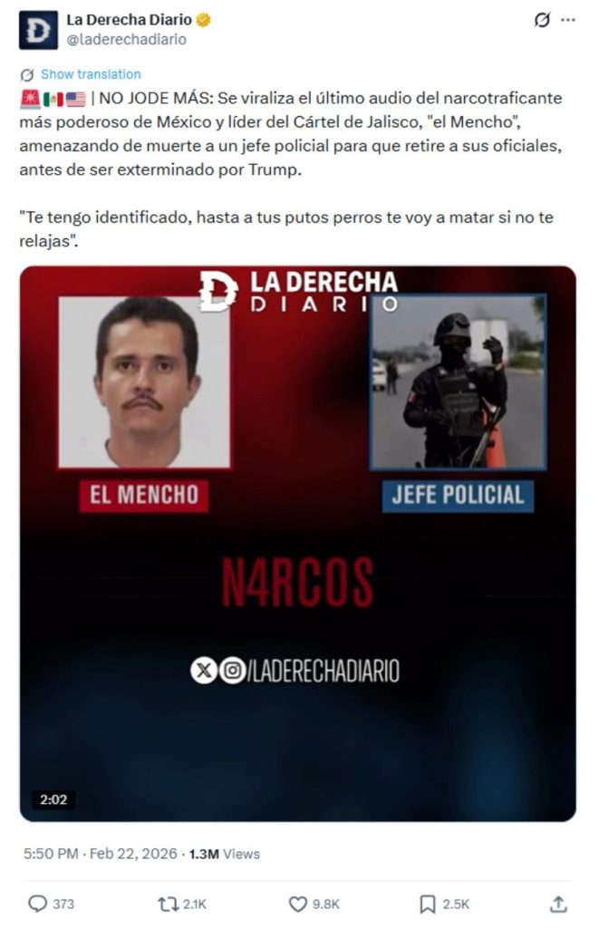 Se viralizó en redes sociales (1,2,3) un supuesto audio de «El Mencho», otrora líder del Cartel de Jalisco Nueva Generación. Según describen las diversas publicaciones, este fue su último registro de voz antes de su muerte.