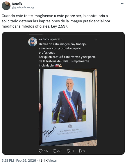 Tras una denuncia presentada ante Contraloría por una supuesta vulneración a la ley en el uso del escudo en la banda presidencial de Kast, se difundió en X que el ente contralor habría solicitado detener las impresiones de la fotografía oficial. Fast Check calificó esto como #Falso, ya que, si bien la denuncia fue ingresada, no se han emitido instrucciones de esa naturaleza.