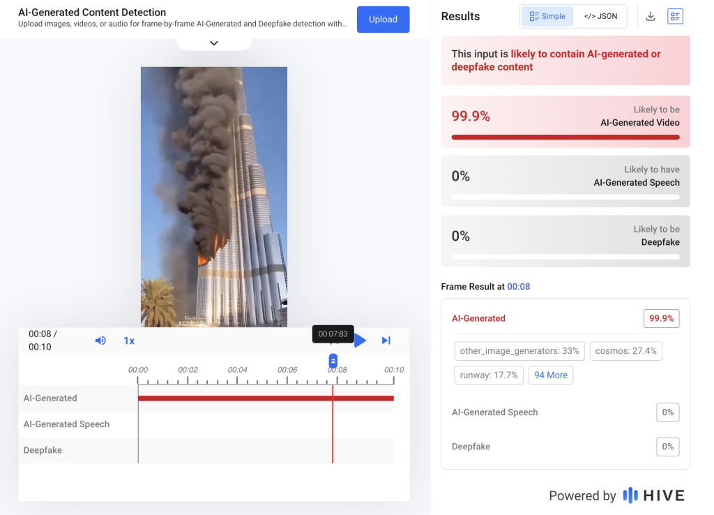 Fast Check califica este contenido como #Falso. El incendio en el Burj Khalifa no ha tenido cobertura mediática ni oficial por parte de autoridades locales. Además, análisis detectaron hasta 99,9% de probabilidades de que el video fue generado con IA.