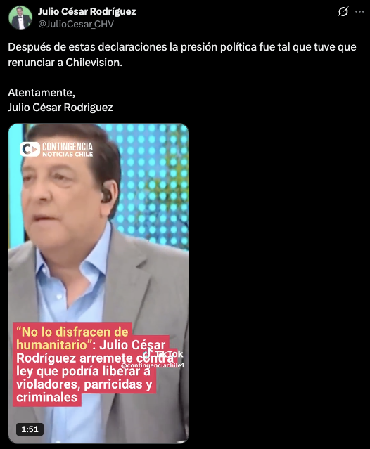 Fast Check calificó el contenido como #Falso. Julio César Rodríguez nunca declaró en X ni a través de algún otro medio que su salida de Chilevisión se deba a presiones políticas o editoriales. El perfil que lo publicó es una cuenta parodia y el propio animador lo desmintió.