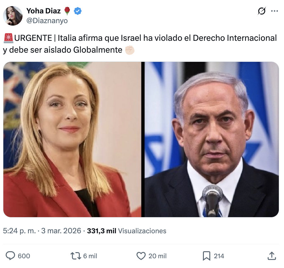 Fast Check califica este contenido como #Engañoso. Si bien el ministro de Defensa italiano, Guido Crosetto, aseguró que la operación en suelo iraní «ciertamente violó el Derecho Internacional», esta no es una postura oficial, y tampoco instó a que Israel sea aislado globalmente. Así lo confirman la primera ministra del país, Giorgia Meloni, y la Embajada de Italia en Santiago.