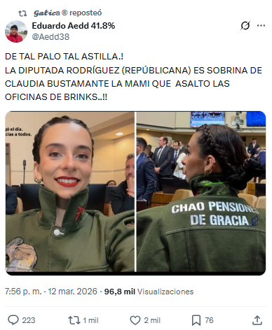 Circula en redes sociales que la recientemente asumida diputada, Javiera Rodríguez (PRep), sería sobrina de la excarabinera —conocida como «La Mami»—, Claudia Bustamante, acusada de orquestar el asalto a la sucursal Brinks de Rancagua en agosto de 2024 (1,2,3).