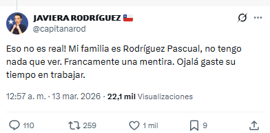 La también periodista de la Universidad Católica afirmó que «eso no es real! Mi familia es Rodríguez Pascual, no tengo nada que ver. Francamente una mentira. Ojalá gaste su tiempo en trabajar», concluyó.