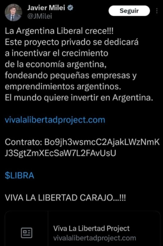 El caso se remonta al 14 de febrero de 2025, cuando el mandatario publicó en su cuenta de X un mensaje fijado en el que promovía —mediante un enlace— un proyecto asociado a $LIBRA, que ofrecía ganancias y respaldo a los inversores.