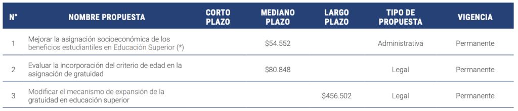 - Mejorar la asignación socioeconómica de los beneficios estudiantiles en educación superior: El sistema actual de asignación de beneficios estudiantiles presenta debilidades en sus mecanismos de asignación, lo que facilita el acceso indebido a la gratuidad y genera ineficiencias. Se propone fortalecer la agenda de modernización en la asignación, integrando de mejor manera el RSH y el FUAS, reforzando los controles de la Subsecretaría de Educación Superior, utilizando registros administrativos e incorporando nuevas herramientas tecnológicas para minimizar inconsistencias y asegurar un uso más eficiente de los recursos.
