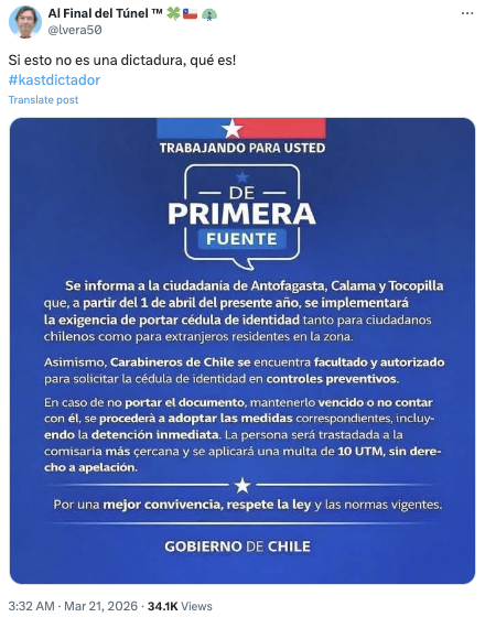 Fast Check califica el contenido como #Falso. No existen registros en canales oficiales del Gobierno de Chile que den cuenta de una supuesta exigencia de portar la cédula de identidad en Antofagasta, Calama y Tocopilla. La información fue desmentida por la Delegación Presidencial Regional de Antofagasta, y se suma a que la legislación vigente no obliga exclusivamente portar este documento, ya que en los controles de identidad se permite la identificación mediante otros medios.