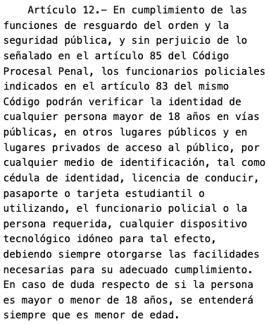 Los funcionarios de Carabineros o de la Policía de Investigaciones (PDI) pueden controlar la identidad de cualquier persona mayor de 18 años en vías o lugares públicos y en lugares privados de acceso público. Para individualizar a la persona, se puede usar cualquier medio de identificación, tal como cédula de identidad, licencia de conducir, pasaporte o tarjeta estudiantil. También se puede usar cualquier dispositivo tecnológico.