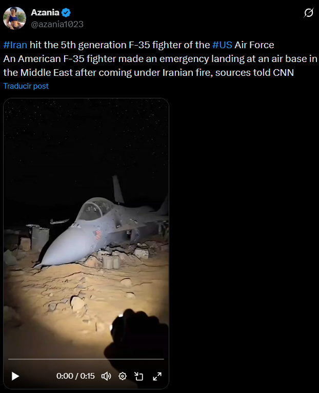 Según informaron varios medios como Infobae y El Confidencial, un caza F-35 estadounidense tuvo que realizar un aterrizaje de emergencia en una base militar aliada no especificada en el Medio Oriente. Aunque se desconocen los motivos oficiales, fuentes anónimas de CNN vinculadas al Comando Central de EE. UU. atribuyen el derribo a un impacto iraní