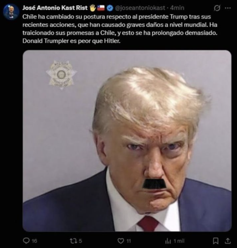 Desde la cuenta @joseantoniokast se difundió una imagen acompañada de un texto que hacía referencia al mandatario estadounidense. En la publicación se señalaba que Chile habría cambiado su postura respecto de Trump debido a supuestos daños provocados por sus recientes acciones, finalizando con una comparación con Adolf Hitler.