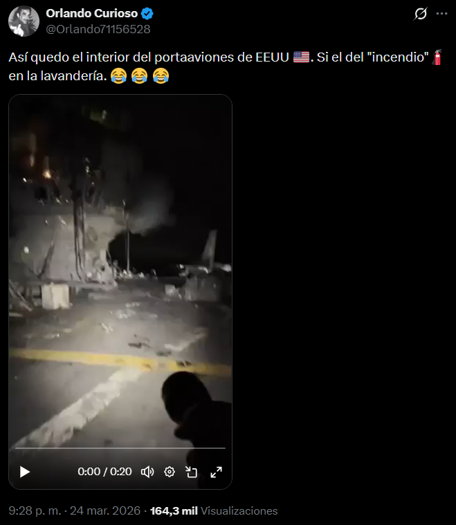 Videos en la red social X (1,2,3) muestran, a trav茅s de una exploraci贸n nocturna, lo que ser铆an los restos del portaaviones estadounidense USS Gerald R. Ford despu茅s del incendio fuera de combate, que ocurri贸 el 12 de marzo en el sector de lavander铆a dentro de la embarcaci贸n. Las publicaciones verificadas acumulan m谩s de 8 mil 芦me gusta禄 y 600 mil visualizaciones.