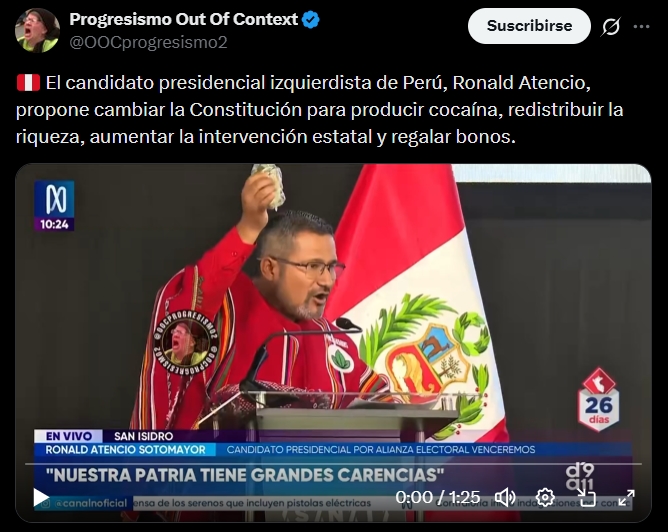 Se ha viralizado un video (1,2,3) del discurso público del abogado y actual candidato presidencial de Perú, Ronald Atencio Sotomayor, integrante de la alianza política de izquierdas, Venceremos, supuestamente proponiendo la legalización de la cocaína. Las publicaciones cuentan con más de 500 mil visualizaciones.