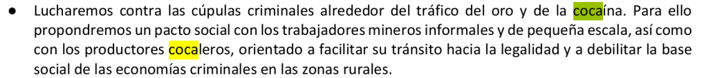 Dentro del escrito «31 propuestas para refundar el Perú de la mano con el pueblo», al ubicar la segunda propuesta sobre «Aniquilar el crimen. Lucha frontal contra el crimen organizado y la corrupción», encontramos que una de las medidas busca facilitar el tránsito legal de la hoja de coca para debilitar la economía del crimen organizado.