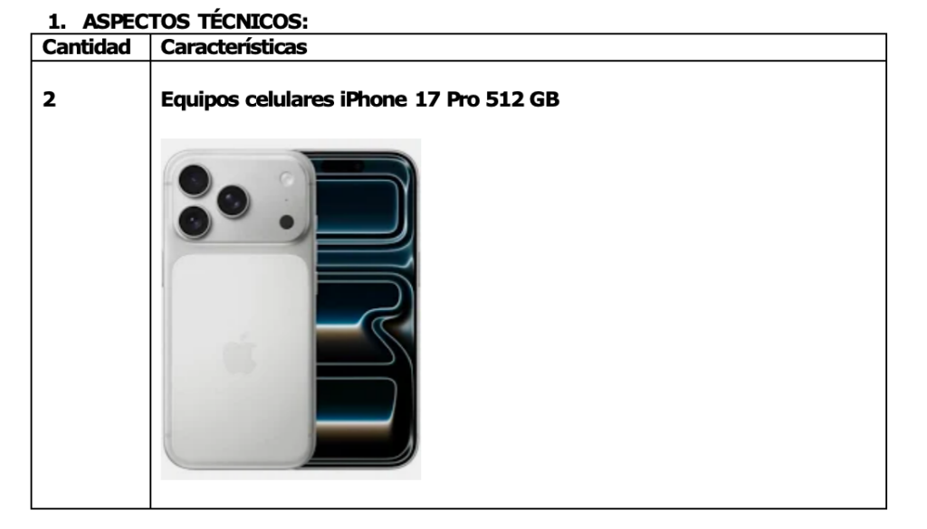 En el documento adjunto —titulado «Requerimiento iPhonne 17 Pro.docx»—, que detalla la solicitud, se incluye un cuadro con las características técnicas requeridas para los dispositivos: iPhone 17 Pro de 512 GB. Esta especificación provocó que, menos de 24 horas después, el 27 de marzo a las 11:51, el proceso fuera cancelado por «definir un modelo asociado a marca».