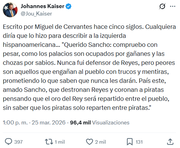 El excandidato presidencial y timonel del Partido Nacional Libertario, Johannes Kaiser, compartió esta semana un presunto fragmento de la obra literaria de Miguel de Cervantes a través de su cuenta de X.