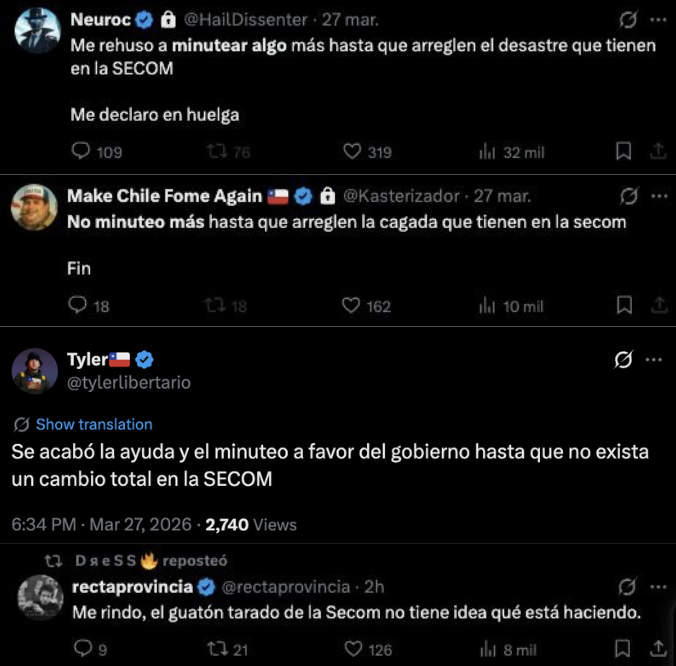 En cuanto a las publicaciones en redes sociales, la cuenta «Neuroc» publicó: «Me rehúso a minutear algo más hasta que arreglen el desastre que tienen en la SECOM. Me declaro en huelga». En la misma línea, «Make Chile Fome Again» escribió: «No minuteo más hasta que arreglen la cagada que tienen en la SECOM. Fin».