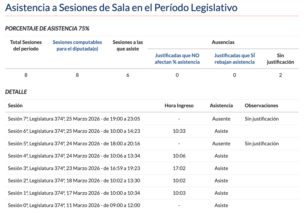 Fast Check califica lo dicho por Franco Parisi como #Real. Tras revisar el apartado de asistencias del diputado Cristian Contreras —Doctor File— en el sitio web de la Cámara de Diputadas y Diputados, se constató que efectivamente presenta un 25% de inasistencia en las sesiones en sala, con dos ausencias de ocho sesiones en total.