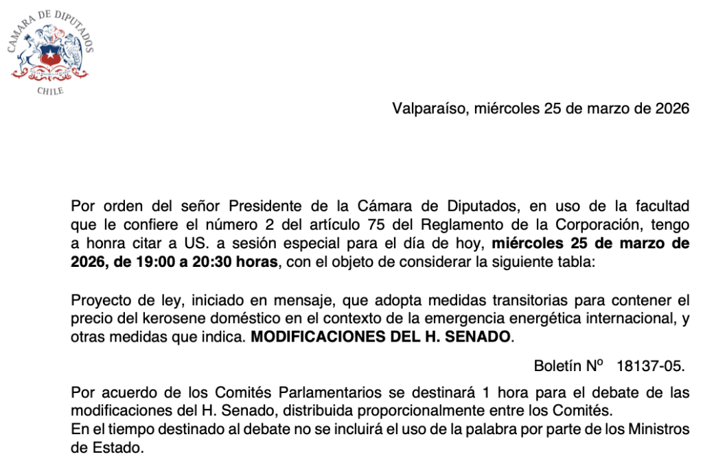 La quinta sesión de sala tuvo por objeto tratar el proyecto de ley que «adopta medidas transitorias para contener el precio del kerosene doméstico en el contexto de la emergencia energética internacional» en su primer trámite constitucional.