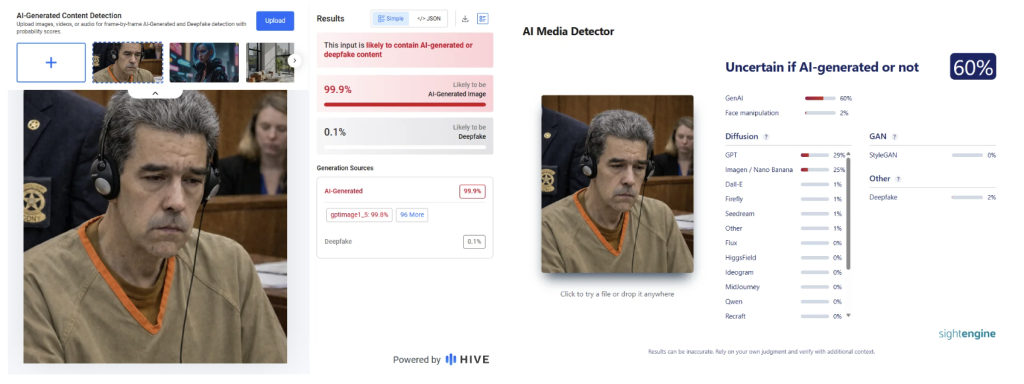 Izquierda: resultados de Sightengine. Derecha: resultados de Hivemoderation.