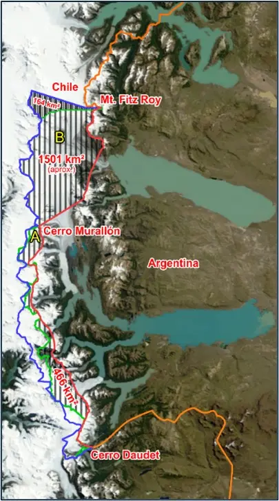 Sí. En la zona A, la más austral, se habrían perdido aproximadamente 466 kilómetros cuadrados. En la zona B, el máximo posible de pérdida sería de unos 1.337 kilómetros cuadrados si el límite se corre hacia el cordón Mariano Moreno. Ese acuerdo de Chile- Argentina de 1998 permite que cedamos 1.800 km del Campo Hielo Sur.