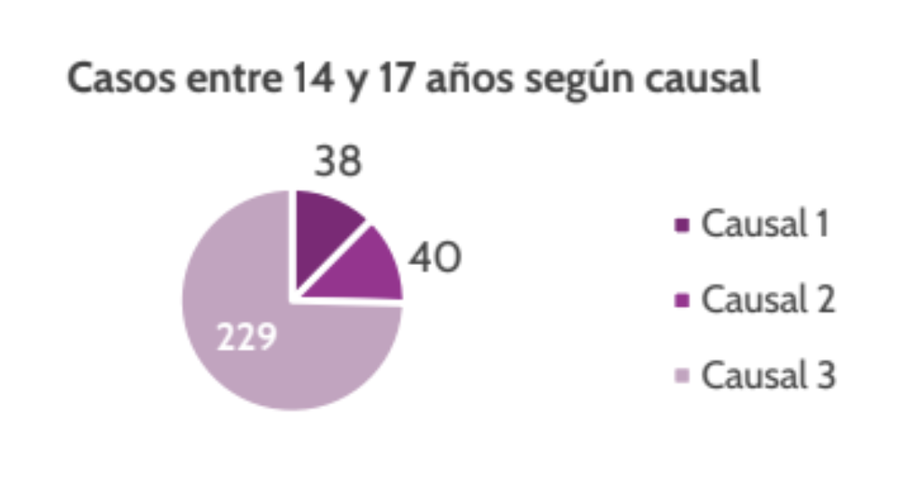 Para las adolescentes entre 14 y 17 años, si bien se observa mayor presencia de otras causales, la violación continúa siendo la principal razón de ingreso, con 229 casos. En este grupo también se contabilizan 40 casos por inviabilidad fetal y 38 por riesgo vital de la gestante.