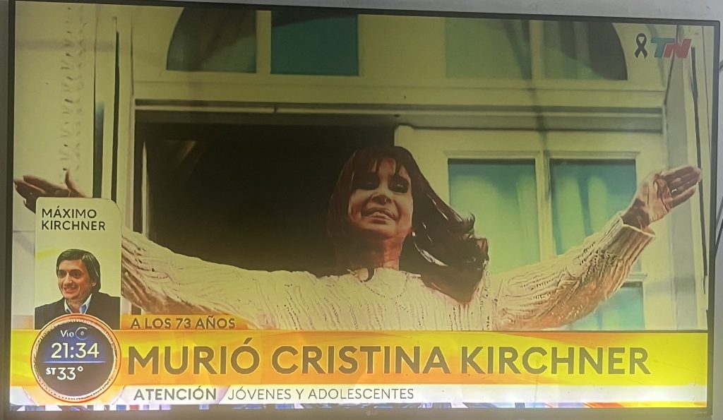 Fast Check califica este contenido como #Falso. No existen comunicados, reportes oficiales ni registros de prensa que confirmen el fallecimiento de la expresidenta argentina Cristina Fernández de Kirchner. Asimismo, el canal Todo Noticias (TN) desmintió la autoría de la gráfica, confirmando que la imagen es un montaje.