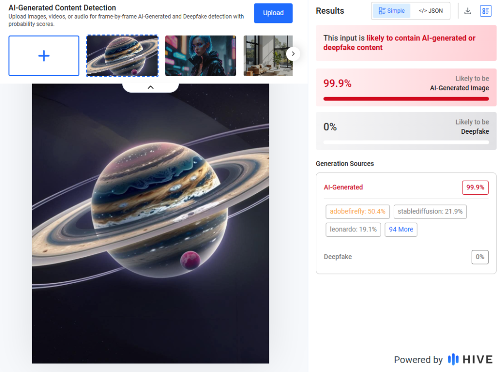 Tras la pesquisa, se introdujo la imagen en un software especializado para identificar si contiene indicios de haber sido generada por inteligencia artificial. Se utilizaron las herramientas Hive Moderation, Undetectable AI y Zhuque AI Detector para verificar los resultados.