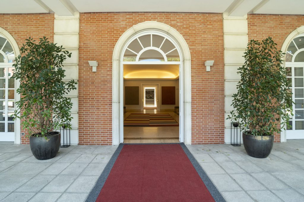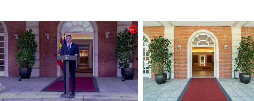 En el video se aprecia de fondo un edificio de ladrillos rojos, pilares blancos, con un vitral arriba de la puerta. El lugar indicado en las notas de prensa es el Palacio de Monclade, casa utilizada por el presidente de turno en España.