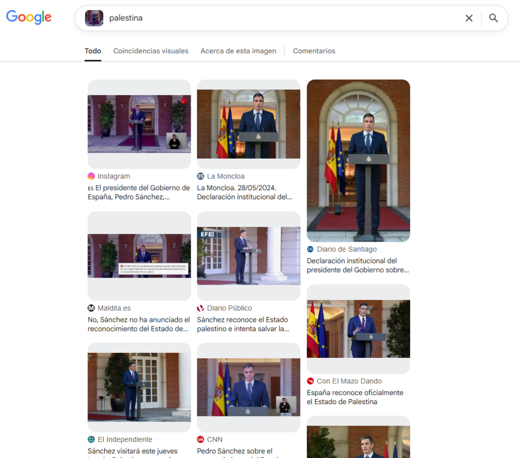 Se realizó la búsqueda inversa de una captura del video, agregando la palabra clave «Palestina» y se llegó a distintas publicaciones del mismo video: una de ellas perteneciente a La Moclade, pagina web del Gobierno Español.