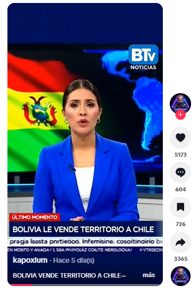 Fast Check califica este contenido como #Falso. No existe información oficial sobre la venta de territorio boliviano a Chile; además, el fragmento audiovisual fue generado con inteligencia artificial.