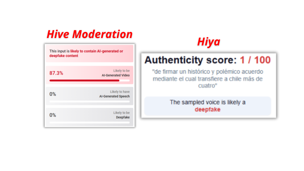 Fast Check procesó el video con las herramientas Hive Moderation e Hiya. La primera arrojó un 87,3% de certeza sobre su origen sintético, mientras que la segunda determinó que la probabilidad de que el audio sea real es de solo un 1%.