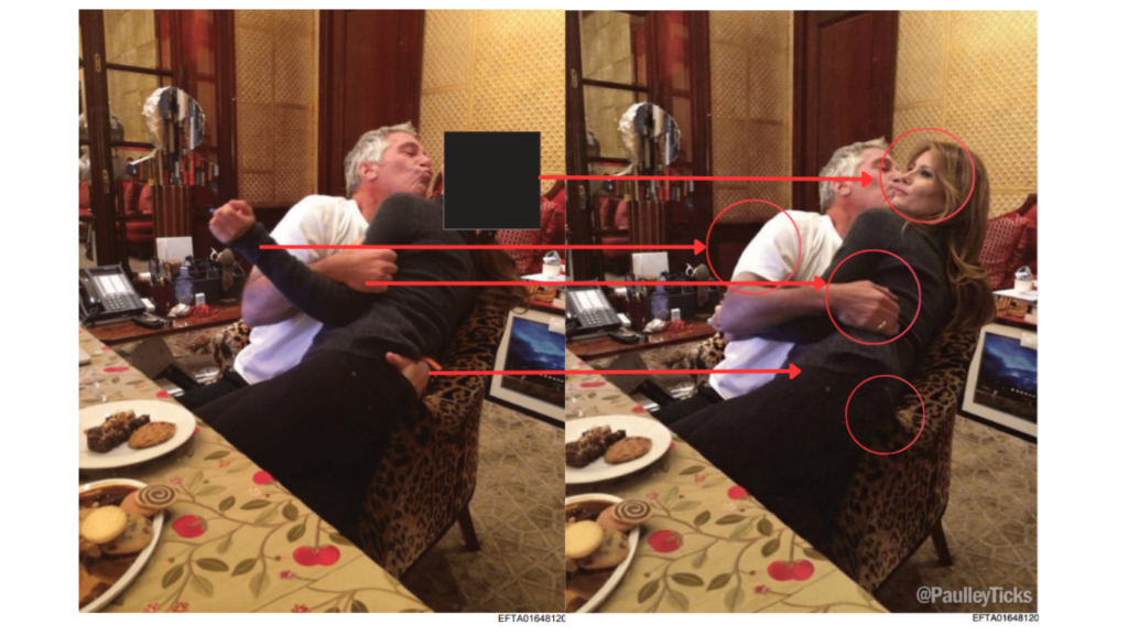 Se comparó la imagen de los Archivos de Epstein identificada como EFTA01648120 con la versión viral. Este análisis permitió comprobar que la imagen fue editada, ya que se agregaron elementos como manos, brazos y el rostro de Melania Trump.