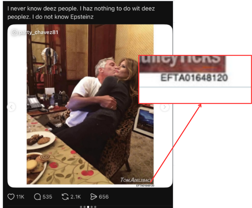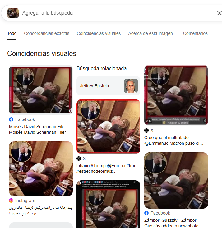 Ante la ausencia de una imagen oficial, se amplió la publicación eliminando los bordes rojos y otros elementos añadidos, conservando únicamente los rostros de Jeffrey Epstein y Melania Trump. A partir de este recorte, se realizó una segunda búsqueda en donde se encontró una versión más completa de la imagen circulando en X.
