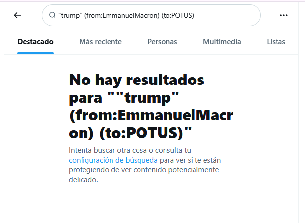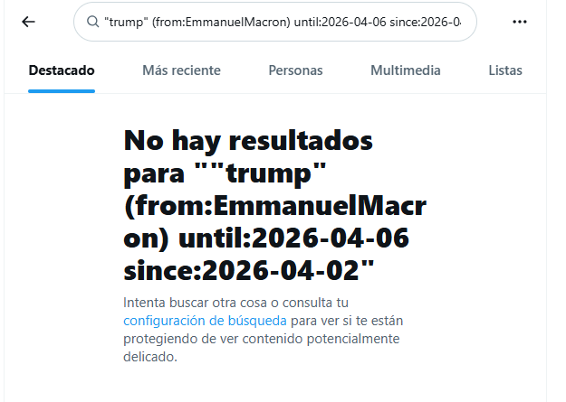 La búsqueda arrojó cero resultados. Por otra parte, se probó utilizando solo tuits que sean de Emmanuel Macron que incluyesen la palabra «Trump», en el periodo del 2 al 9 de abril del 2026.