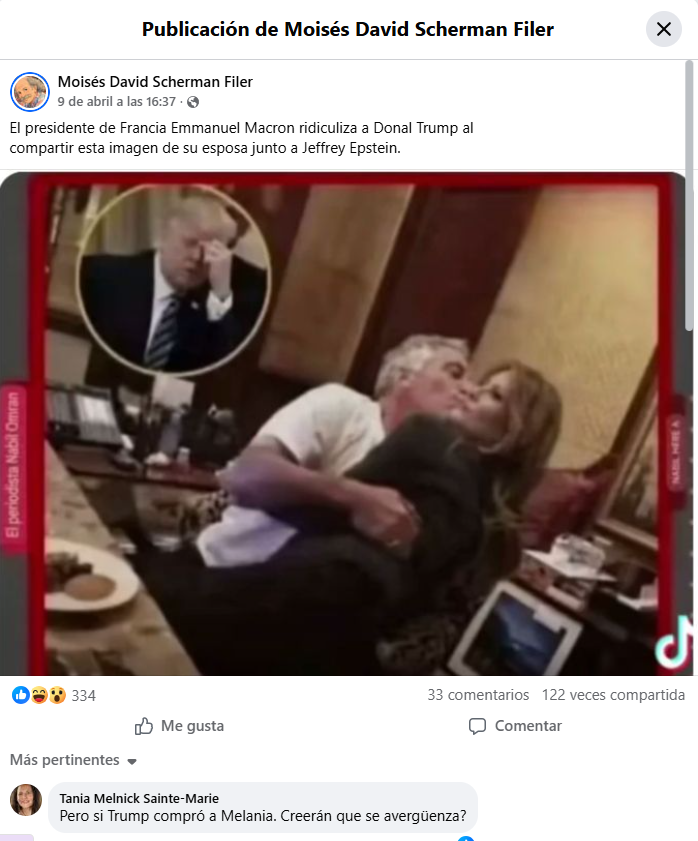 En redes sociales circula una imagen (1), donde la primera dama de los Estados Unidos, Melania Trump, se encuentra junto a Jeffrey Epstein en un bar. En la publicación que comparte esta imagen se indica además, que el presidente de Francia, Emmanuel Macron, compartió esta foto por la redes sociales.