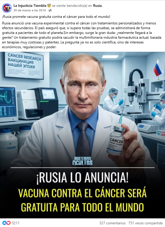 Circula en redes sociales una publicación sobre la cura para el cáncer, En ella se anuncia que Rusia inventó una vacuna personalizada para curar el cáncer y que promete será gratis para todo el mundo. Fast Check calificó el contenido como #Falso. Si bien, Rusia esta trabajando en una vacuna personalizada, no hay anuncio de que se distribuirá de manera gratuita ni que cure todos los cáncer.