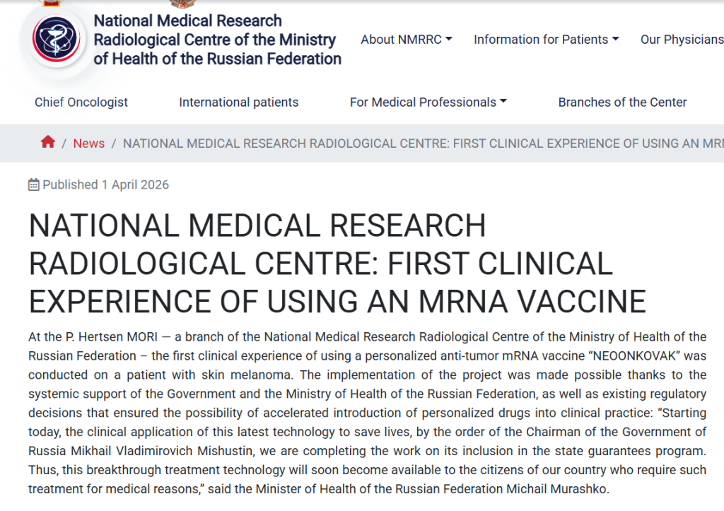 • NMIRCR.ru: Autorización para ensayos clínicos de la vacuna contra el cáncer.