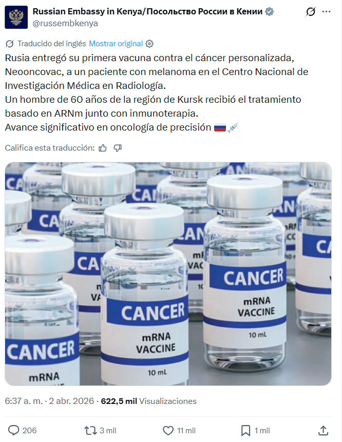 🇷🇺 Rusia acaba de marcar un hito médico: aplicó por primera vez una vacuna personalizada contra el cáncer 💉 desarrollada completamente en su territorio. El tratamiento, basado en tecnología de ARNm y denominado Neooncovac, fue administrado a un paciente de 60 años con melanoma cutáneo en un centro especializado en radiología médica.