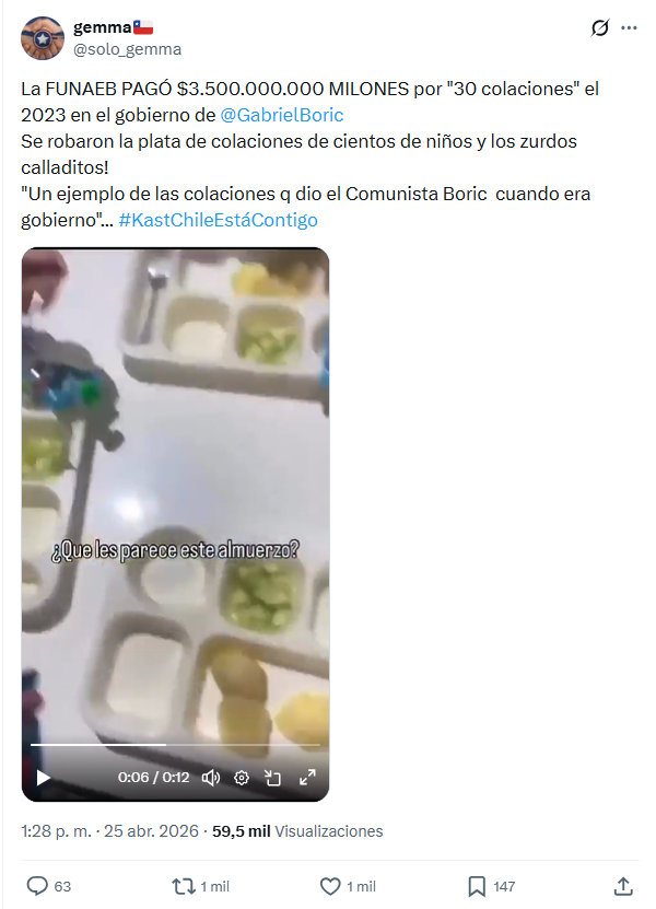 «La Junaeb pagó $3.500.000.000 millones por “30 colaciones” el 2023 en el gobierno de Gabriel Boric.