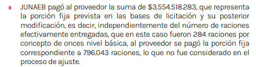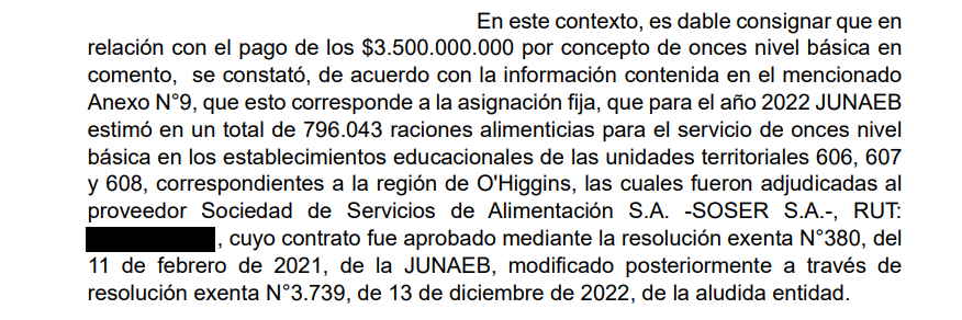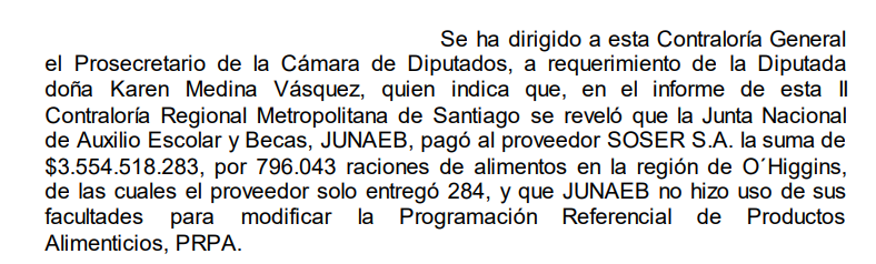 Esta información concuerda con el oficio entregado por Contraloría, en el que se indica que se pagó un total de $3.554.518.283 a la empresa Soser S.A. De todas formas, es importante precisar que originalmente la licitación se hizo por un total de 796.043 raciones de alimentos, pero finalmente solo se hizo entrega de 284. Producto de ello, se inició una investigación por parte de Contraloría que actualmente sigue en curso.