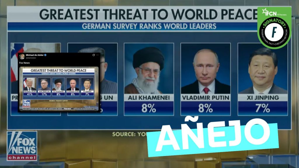 Se comparte en X una supuesta encuesta que posiciona a Donald Trump como la principal amenaza para la paz mundial. Fast Check califica esto como #Añejo, ya que si bien la imagen es real, sucedió en 2019, por lo que no es actual.